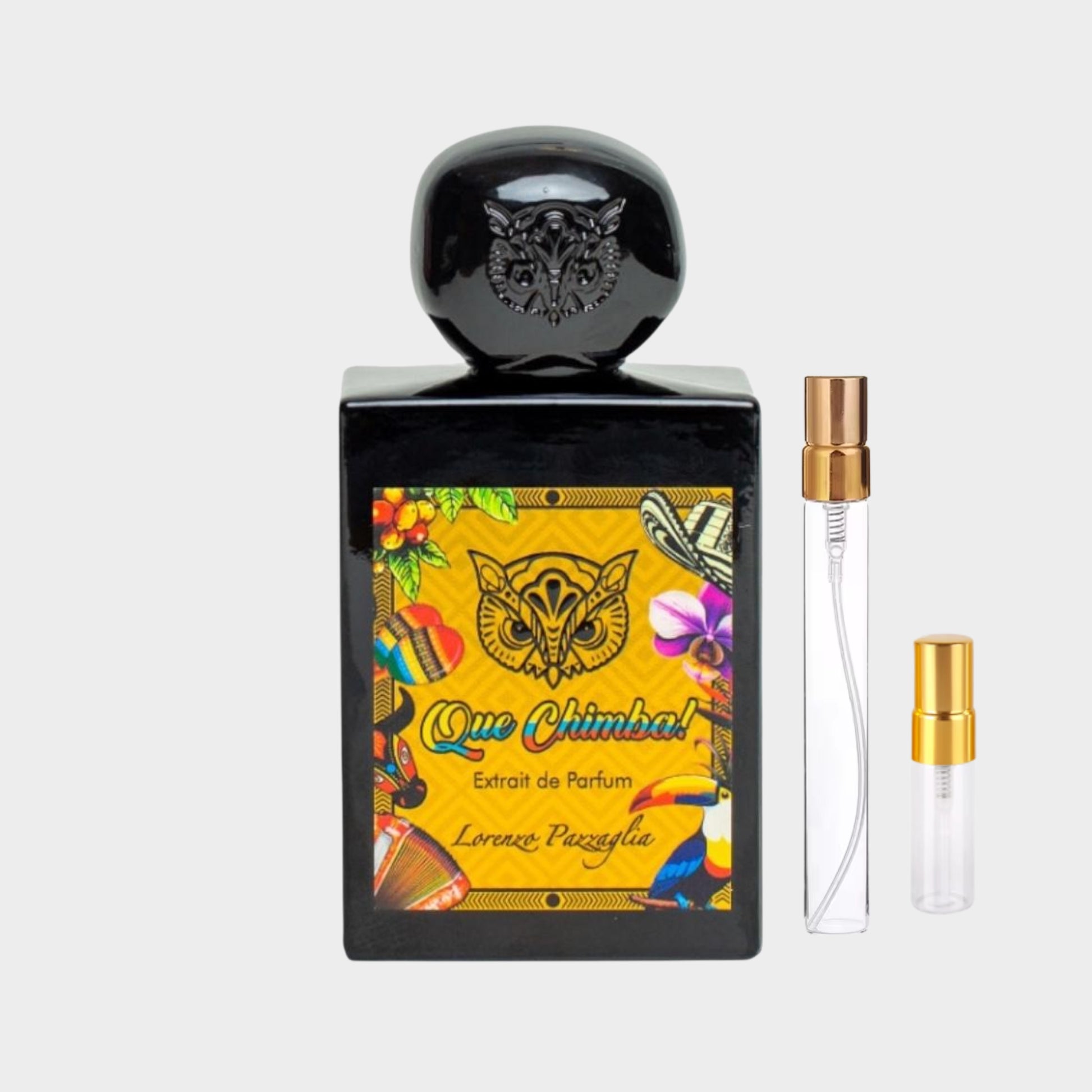 Que Chimba! de Lorenzo Pazzaglia es una fragancia unisex oriental-floral que mezcla lo exótico y lo cálido de manera vibrante. Se abre con una explosión tropical de guayaba, maracuyá y durazno, acompañadas por una pimienta de sabor cálido, clavos, jengibre y anís estrellado, entregando un comienzo jugoso, especiado y atrevido. En el corazón salen a relucir notas más profundas como tabaco dulce, haba tonka, orquídea, heliotropo y rosa damascena, que aportan una capa floral-amaderada suave y sensual. El fondo está compuesto por cedro, sándalo, patchouli, vainilla, benjuí, ámbar y ámbar gris, que alargan la estela con cremosidad, riqueza y un cálido eco oriental que perdura.